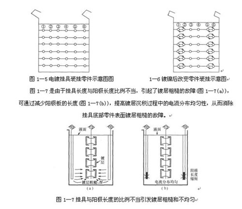 有些電鍍故障,經(jīng)常出現(xiàn)在零件的固定部位或掛具某些部位的零件上。出現(xiàn)這種現(xiàn)象時,可以用改變零件的裝掛位置或裝掛方向,來觀察故障現(xiàn)象是否隨裝掛位置(或方向)的改變而改變,如圖1-5所示某塑料鍍鉻零件裝掛。在鍍鉻時經(jīng)常在掛具左邊或右邊最外面一排零件出現(xiàn)棕褐色鉻層。出現(xiàn)故障后,一直認(rèn)為這種故障是鍍鉻過程中產(chǎn)生的,所以就一直采取處理鍍鉻溶液的方法,但半年多都沒有排除故障,后來用改變零件裝掛位置進行試驗,發(fā)現(xiàn)故障起源于鍍鉻以前。故障現(xiàn)象出現(xiàn)在第1排或第6排零件上(偶爾也不出現(xiàn)這種故障),通過改變零件裝掛位置尋找故障的起源,將鍍好光亮鎳后的第1排與第2排的零件交換位置;第6排與第5排的零件交換位置(圖1-6)。改變裝掛位置以后進行鍍鉻,故障現(xiàn)象不是出現(xiàn)在最外面一排,而是出現(xiàn)在第2排或第5排的零件上。說明故障起源于鍍鉻以前,與鍍鉻液無關(guān)。經(jīng)過多種方法試驗,最后找出來是光亮鎳鍍好以后出槽時,一個掛具零件還在電鍍,這一掛具出槽時,靠近電鍍掛具的出槽零件表面產(chǎn)生了雙性電極而造成的。可見這一起故障,若不用改變零件裝掛位置進行試驗,故障的起因就很難找到。
